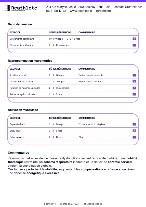 L’évaluation met en évidence plusieurs dysfonctions limitant l’efficacité motrice : une mobilité thoracique restreinte, un schéma respiratoire inadapté et un déficit de contrôle cervical altèrent la coordination globale.