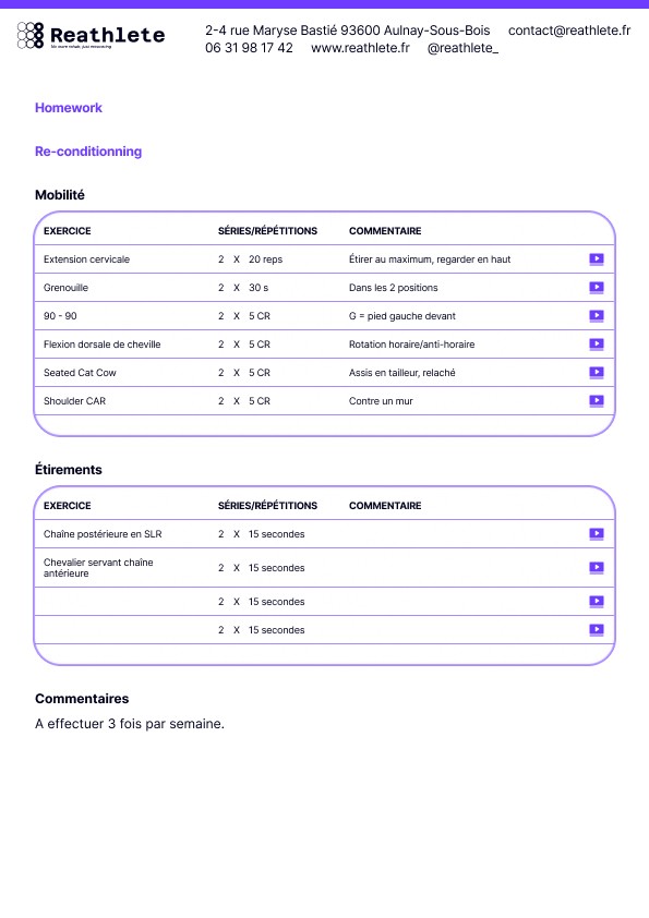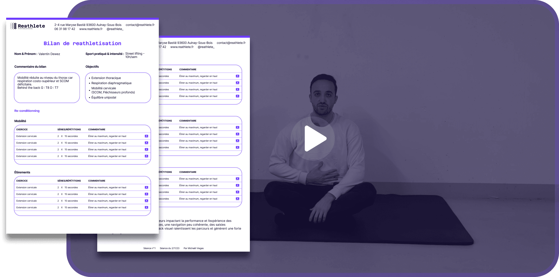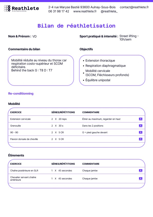 Le bilan de profilage Reathlete est accessible autant aux athlètes blessés, ou avec des douleurs liées à l’entrainement, qu’aux athlètes non blessés. Dans le cas d’une blessure ou d’un douleur persistante liée à l’effort, le bilan permettra de cibler l’origine du problème pour pouvoir prescrire un programme évolutif en fonction de la pathologie et de l’avancer du patient. Dans le cas d’un athlète non blessé, avoir un programme de suivi pour la gestion du stress mécanique et d’amélioration de la performance, ne fera que de diminuer le risque de blessures.